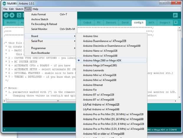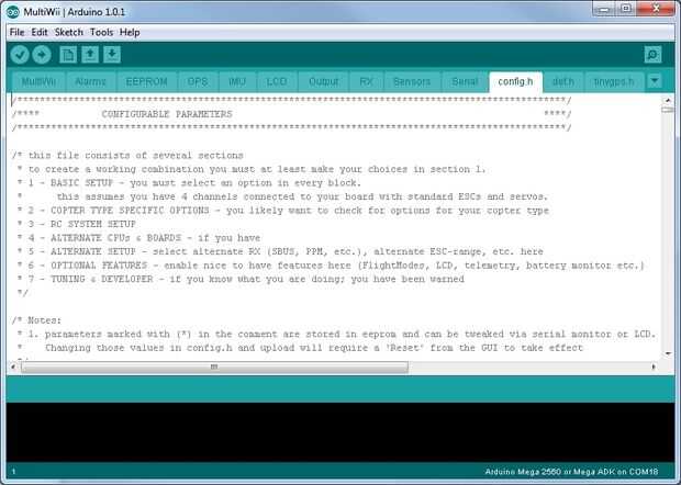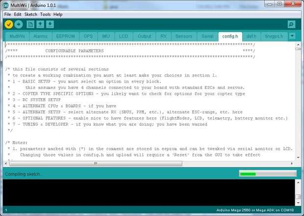 9. porque ya he configurado este bosquejo MultiWii para el quadcopter describí edificio, usted puede simplemente haga clic en archivo -> cargar. Habrá una barra de estado en la parte inferior de la ventana de Arduino que diga "Compilar" luego "subir". Espere hasta que la barra de estado dice "done Uploading".