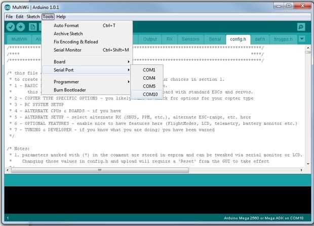 8. Haga clic en herramientas -> Puerto serie y seleccione serial port que se instala cuando usted esté conectado en el FC. Si no estás seguro de que puerto COM entonces haga clic en herramientas para cerrar el menú desplegable, desenchufe la FC desde el puerto USB, luego haga clic en herramientas -> Puerto serie otra vez y anotan todos los puertos serie listados. Ahora haga clic en herramientas para cerrar el menú de nuevo, conecte el cable USB en el FC otra vez y vuelve a las herramientas -> menú del puerto serie. Seleccione cualquier puerto serie está en la lista que previamente no estaba lista cuando escribiste.