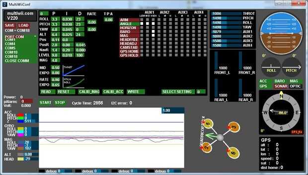 3. en el lado izquierdo del programa MultiWiiConf, seleccione el puerto COM que está conectado a la FC (la misma seleccionada en el software de Arduino). Después de que se conecta a la FC, la lista de puertos COM, así como los botones de START y STOP en la aplicación media cambiará de rojo a verde.