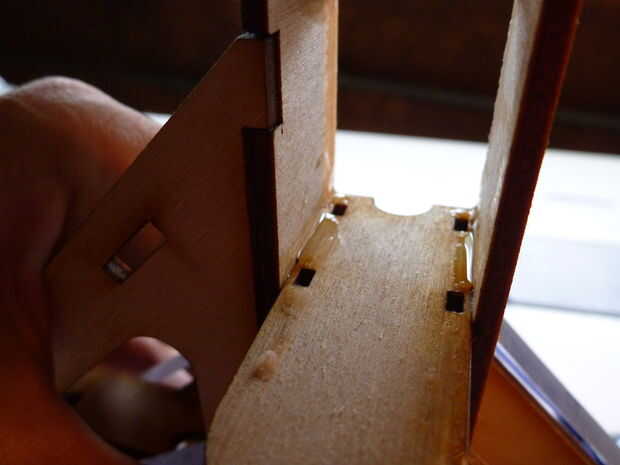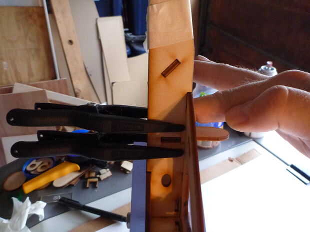 4. con el centro de la estructura fijada, utilice abrazaderas de resorte pequeño una pareja cerca de un pedazo de pierna y pegar la pierna a los lados del brazo como se muestra. Utilice primero la CA super delgada, entonces volver a través del vacío relleno CA y poner los filetes a lo largo de cada costura. Puede utilizar acelerador de CA para endurecer la brecha CA de llenado más rápido y evitar quedarse sin lugar. Evite que la cola en las 4 ranuras pequeñas en las piernas. Si tienes pegamento en las ranuras será mucho más fácil soplar hacia fuera mientras que es húmedo, que a la viruta que después es difícil.  Repita este paso para cada una de las otras 3 patas.