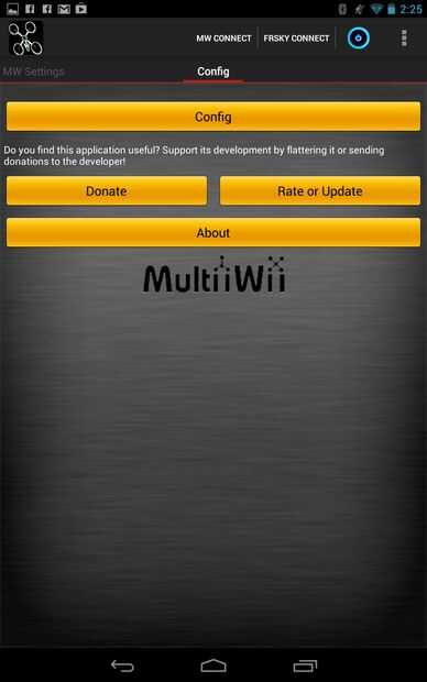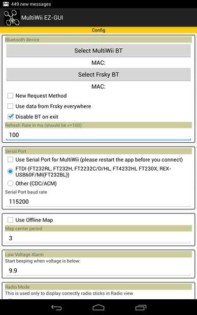 Primero conecte la batería quadcopter y asegúrese de que el módulo de bluetooth tiene una luz intermitente. A empezar la MultiWii EZ-GUI y pase un par de pantallas y luego presione el botón Config para traer la pantalla de configuración. Haga clic en el botón de 'Seleccionar MultiWii BT'. Un menú emergente se abra, haga clic en "Scan para dispositivos". Debe encontrar el módulo de bluetooth de tu quad (mina fue llamado "HB01", haga clic en eso. El menú emergente se cerrará y ahora habrá algunos números al lado de la palabra "MAC:" bajo el botón de seleccionar bluetooth. Pulse el botón back de su dispositivo para salir de la pantalla de configuración.