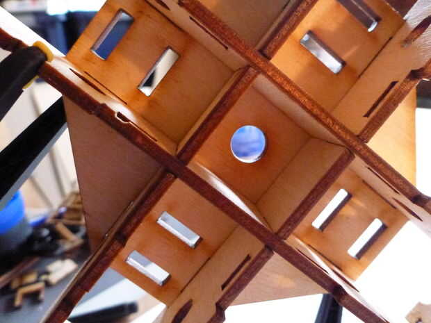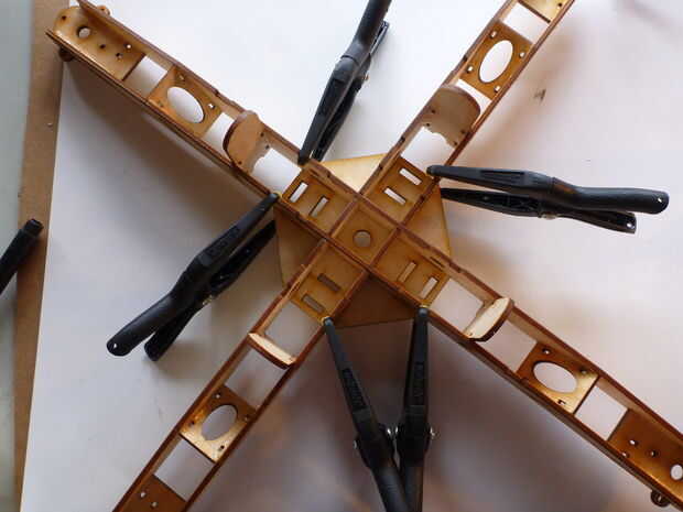 7. Quite la abrazadera del centro del bastidor y quitar el la pieza inferior. Verificar que la pieza superior se presiona completamente en los brazos y la parte inferior de cada brazo está al ras con la parte inferior del brazo donde se cruzan, puede que desee utilizar las abrazaderas de muelle pequeño para ayudar con eso.  Pegue las costuras donde la ranura de armas junto con super delgada CA seguida por la brecha de relleno CA. A continuación encolar todas las costuras donde la pieza de arriba con los brazos.