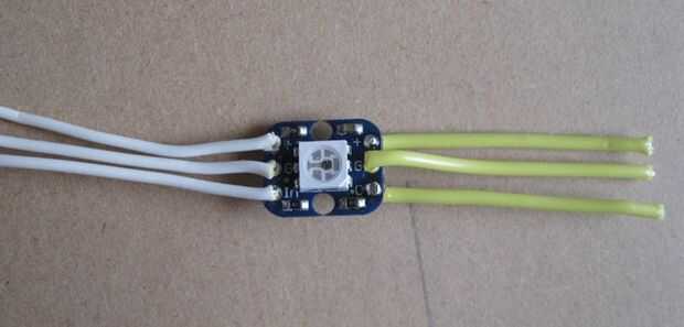 La soldadura de tres longitudes de 18 pulgadas de alambre de calibre 26 trenzado a las entradas de la Junta de Neopixel. Porque estos son trenzados es importante estañar la punta del cable antes de conectarlo.