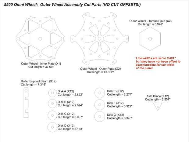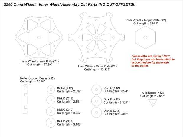 El archivo zip adjunto contiene la lista de materiales para una rueda completa y archivos de Corel Draw las piezas que necesitan ser cortados.