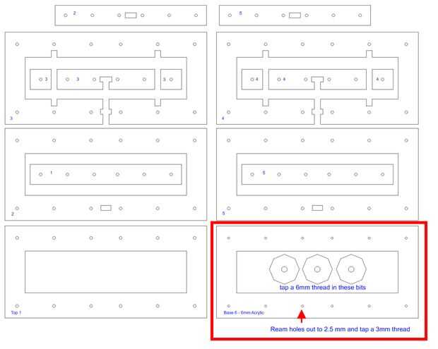 Necesitará Laser cortó la base de las piezas prensa y perilla de 6 mm de acrílico según el dibujo. El resto se puede cortar de la madera contrachapada de 3 mm. Tenga en cuenta que las piezas están numeradas en el orden en que están dispuestos hasta en. Tenga cuidado de que los pedazos más pequeños se orientan según el plano ya que no son cuadrados.