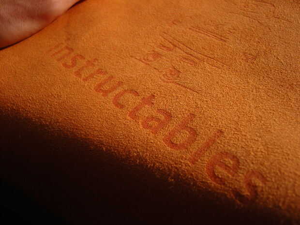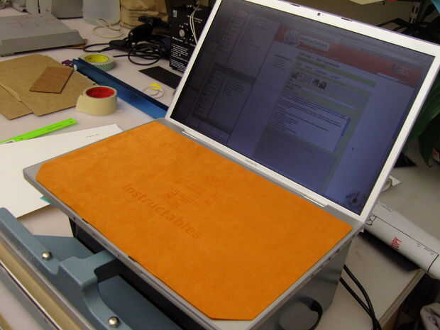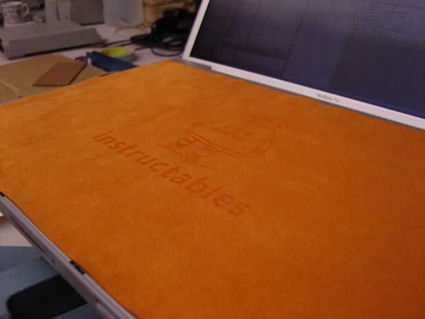Después de hacer algunas investigaciones, encontré que el mejor material para estos protectores de pantalla, "Ultrasuede", es fácilmente disponibles y mucho más barato al comprar a granel. Por lo tanto, compré un par de yardas y había utilizado el cortador del laser en la sede de Instructables para corte de precisión yo algunos protectores de pantalla, con la imagen grabada de la robusteza de Instructables.