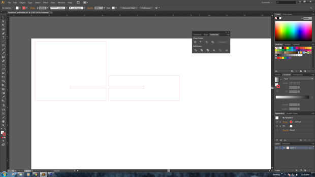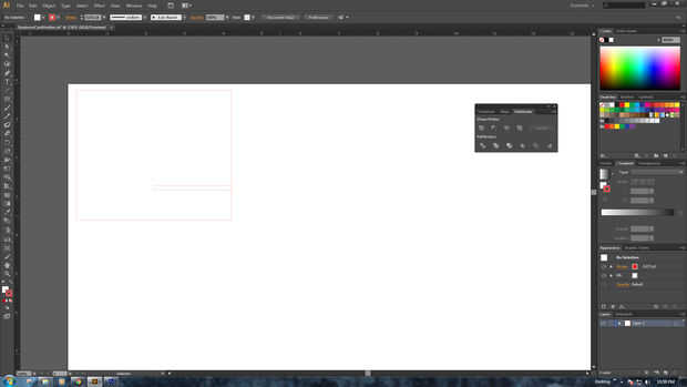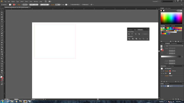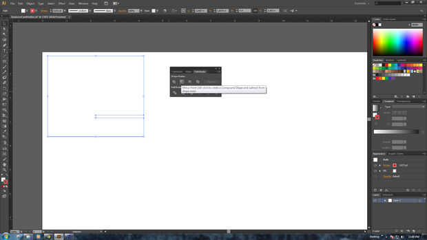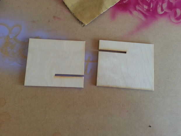 El primer paso fue crear el archivo en Illustrator. Una tarjeta de visita estándar es 3-1/2" ancho x 2" de altura así que hice la primera pieza del tarjetero 4" de ancho x 3-3/8" de altura para ser un poco más grande que la tarjeta de presentación en todas las direcciones. Entonces hice una caja más pequeña del mismo grosor que la madera contrachapada (0,115") x la mitad del ancho de la pieza principal (2"). Coloqué la porción más pequeña de la corte sobre la pieza más grande y luego seleccionado el botón "Menos frente" debajo de la herramienta Buscatrazos para crear una abertura en la pieza más grande. Luego usé los mismos pasos para crear una pieza más corta que se engancharán con el pedazo más grande después de que ambos son corte hacia fuera. Se adjunta el archivo de Illustrator aunque ciertamente no se necesita mucho trabajo recrear mi diseño o poner su propia vuelta en él.