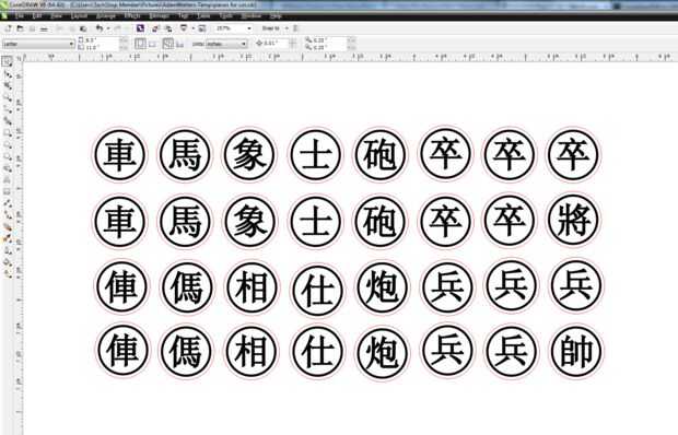 En términos de diseño, yo jugaba con los espesores de los caracteres chinos y los anillos a su alrededor hasta que pensé que se veían bien. Finalmente, se me quitan los anillos de todas las piezas de uno de los lados como una forma de diferenciar las dos partes sin pintura (esto realmente no es totalmente necesario para Xiangqi debido a los dos lados uso distintos personajes para cada piezas, pero dependiendo de estas diferencias sería muy confusos, especialmente si apenas estás aprendiendo a jugar).