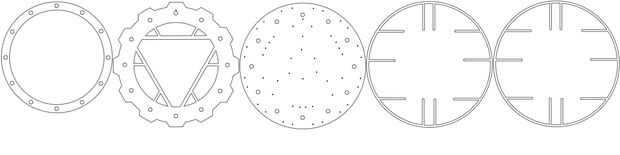 La imagen de arriba muestra las diferentes capas a cortar de acrílico de 1/8", de arriba (izquierda) hacia abajo. La imagen más pequeña muestra piezas a cortar de acrílico de 1/16". Los inferiores (extrema derecha) del molde son sólo anillos de altura con algún soporte (probablemente no es necesario para este molde pequeño, sólo 3" más o menos de diámetro) y son huecas porque la etapa ocupa el molde tiene agujeros tal vez centros de 1" o 3/4", que serían poco probable que se alineen con los orificios de ventilación arbitraria si las piezas inferiores eran esencialmente sólo copias de la pieza media. Además, como se señaló anteriormente, ventilación agujeros sólo debe ser atenuado en la cara de molde, a continuación debe sido tan grande como sea posible.