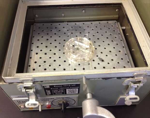 Como necesitamos ventilar los agujeros en cualquier característica cóncava del molde sí mismo, debe haber una manera para el aire al ser aspirado hacia fuera alrededor de la parte inferior del molde, o plástico no se dibujarán hacia abajo alrededor del molde. En este ejemplo, poner algunas tiras finas de acrílico en el molde aumenta lo suficiente para permitir que el plástico que se tirará abajo bien. Si no hacemos esto, el plástico sería no ser tirado pozo, desde temprano en el plástico probablemente cubra los orificios de vacío en la plataforma no dejando donde del aire.