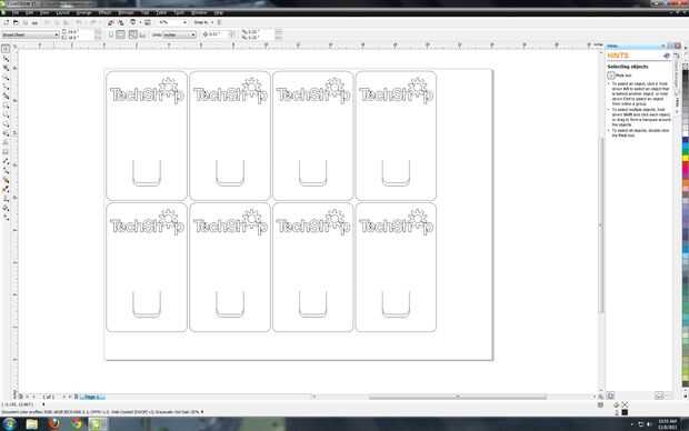 Para este archivo, tengo 100% vectores de rayita--esto significa que todo será una operación de corte en el grabador del laser. Incluso las palabras "TechShop" se desconectará. Alguna imágenes de mapa de bits o vectores líneas más grueso que el grosor de línea de rayita serán grabadas. Para usuarios de Adobe es > pt.001 movimiento.