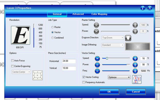 A continuación, bajo las propiedades de impresión elegir a las configuraciones adecuadas para 1/8 acrílico sobre un 60 vatios láser aquí en TechShop San Francisco. La configuración de frecuencia de energía de velocidad en el cuadro de diálogo Propiedades de impresión azul debe ser 16/90/5000 (véase abajo). Es importante tener en cuenta que si usted está cortando sólo un conjunto, no sería necesario utilizar la cama entera 18 x 24 pulgadas. Si este es el caso, registro su trabajo en la parte superior izquierda de la cama láser y asegúrese de que sus dimensiones en el cuadro de diálogo Propiedades de impresión coinciden con la verdadera dimensiones de su trabajo. Esto debe coincidir también en las dimensiones de sus propiedades del documento (Corel Draw), mesa de trabajo (Adobe Illustrator) o tamaño de la hoja (Inventor).