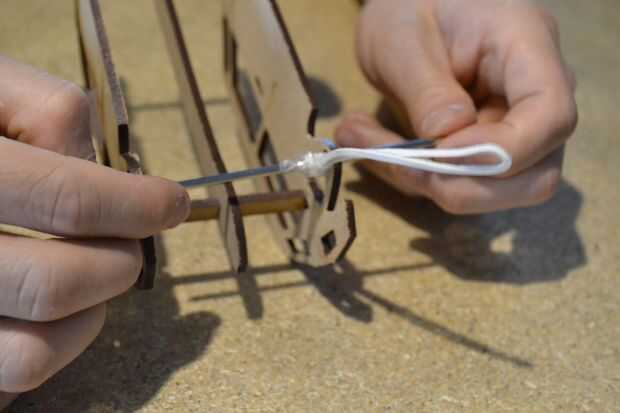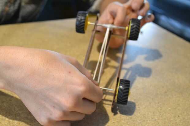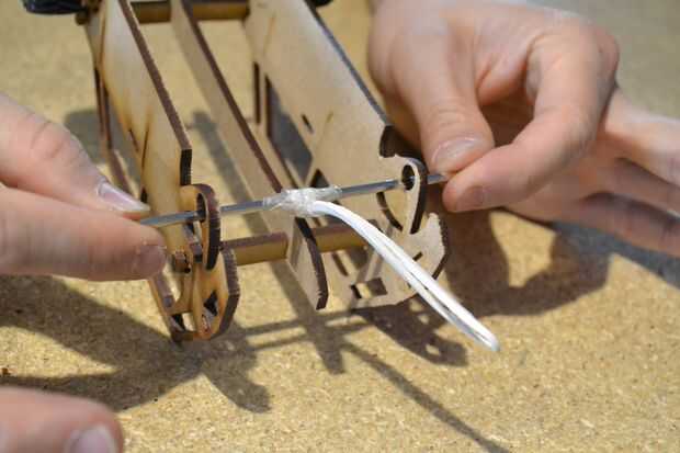 Estiramos la liga del eje trasero y colocamos el otro extremo sobre la parte delantera de la pieza interna de central nuestro carrito. Nos va a quedar como en la quinta foto.