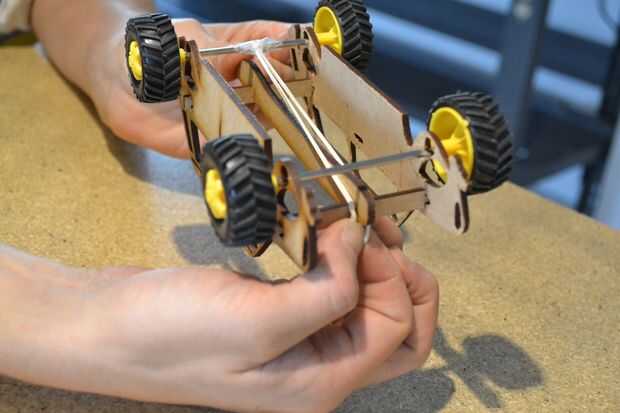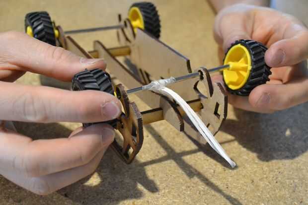 Insertamos el eje a través de las caras laterales del carro y le colocamos las llantas.