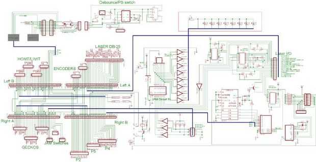 El esquema resume el problema de I/O por el controlador de láser. Hay más de 120 líneas de conectores a interruptores de límite, codificadores, geckos y el tablero de la USC. Todas las líneas fueron conducidas a uno de cuatro 30 pin hembra encabezados. Esto era bueno ir porque reduce cualquier soldaduras u otros tipos de conexiones directas entre los componentes, básicamente todas las conexiones entre componentes se manejaron mediante la vinculación entre los polos de la cabecera usando abrigo del alambre.