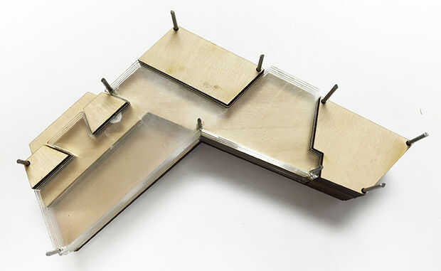 El plan anterior puede ser simplificado un poco más y desarrolló rápidamente como un cutfile de láser. El acrílico se puede utilizar para desarrollar el área continua del espacio de circulación, incluyendo espacios de colaboración y atrio. Sin ser un modelo espacial más grande, las capas de acrílico y Tilo en las cualidades espaciales del atrio, con vistas a la mezzanine del circulación en el segundo piso, así como algunas ideas formales sobre estante el fabricante espacio en el primer piso y áreas de colaboración de vidrio.