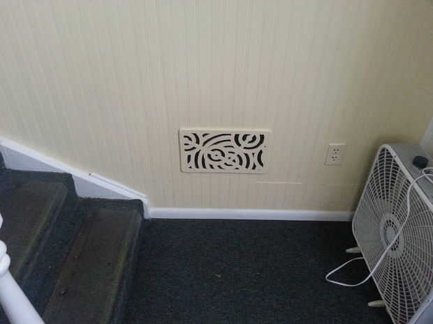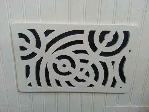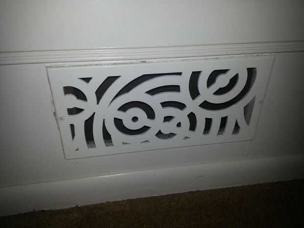 imágenes 3 y 4 son de la cubierta del respiradero del pasillo. Aquí, el yeso viejo rasgado un poco como la portada original fue quitado, así que todavía tenemos que hacer un poco de retoque en los bordes. Una pequeña cantidad de masilla y algunas pinturas curará fácilmente. Curiosamente, se puede ver un poco de la pared detrás de la malla negra alrededor de los bordes (no, eso no es pintura) - no es evidente desde esta perspectiva, pero desde recto se puede ver un rectángulo blanco en segundo lugar, interno que imita la capa detrás de la imagen del concepto. Unintended, que es clase de un efecto fresco y no se hace visible hasta que usted camina cerca.