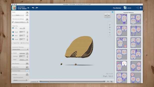 Una vez que tenga todas sus piezas de cortan te puede hacer volver a 123D y le dará a una guía para cada capa del conjunto. Algunas capas tienen múltiples piezas y será marcados como tal. Capa 10 tiene tres piezas, 10-1, 10-2 y 10-3. Mientras se trabaja a través de la Asamblea puede hacer clic en el siguiente paso en la línea de tiempo para ver cómo su modelo físico debe.