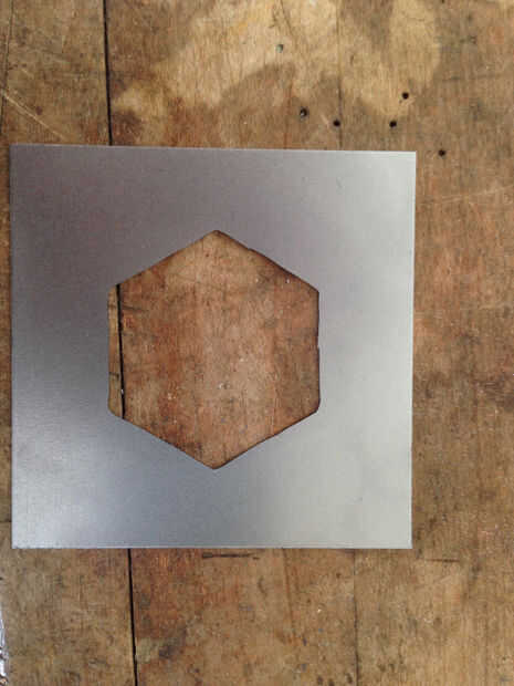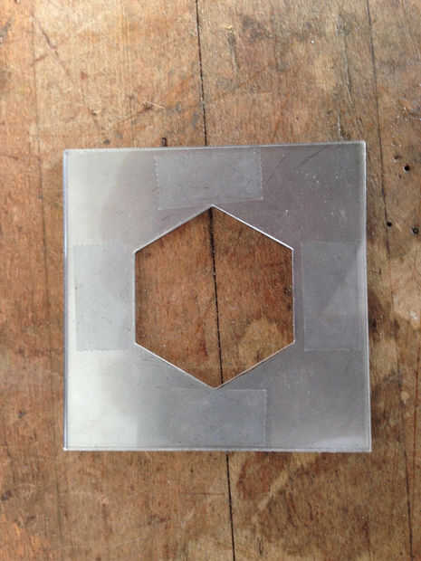Me parece más fácil para cortar el triángulo del centro primero y luego trabajar en los bordes del hexágono para que tenga menos metal en ambos lados de la hoja. También tengo cuidado al girar en cada uno de los vértices - te mueva la sierra hacia arriba y hacia abajo mientras gira, pero no mover la cuchilla hacia adelante, con el fin de dar la hoja algo de espacio para moverse. Incluso con todo eso, mi acero muere no es perfecto, pero en conjunto con la plantilla de acrílico láser, todavía le dará una gran impresión. Así que usaré alguna cinta de doble cara para pegarlas juntas. La combinación de acero calibre 20 con 1/8 acrílico (más el leve espesor de la cinta) nos ayudará a lograr hexágonos relativamente planas con un poco de profundidad - estas llevará a cabo en el esmalte muy bien, sin exigir demasiado puede capas para llenar.
