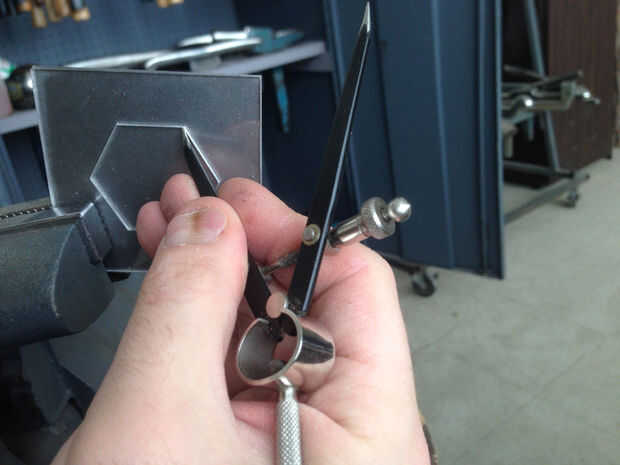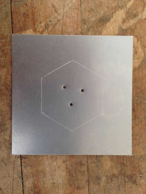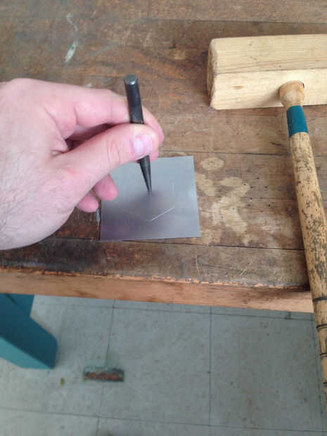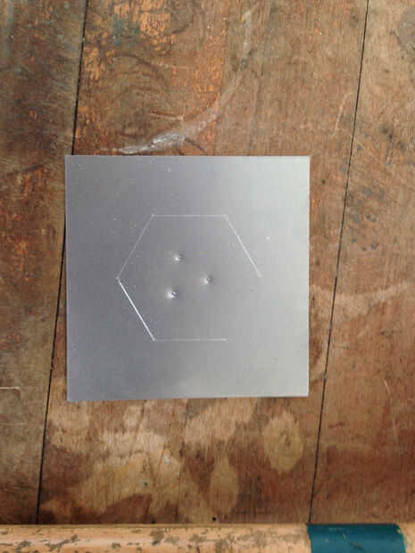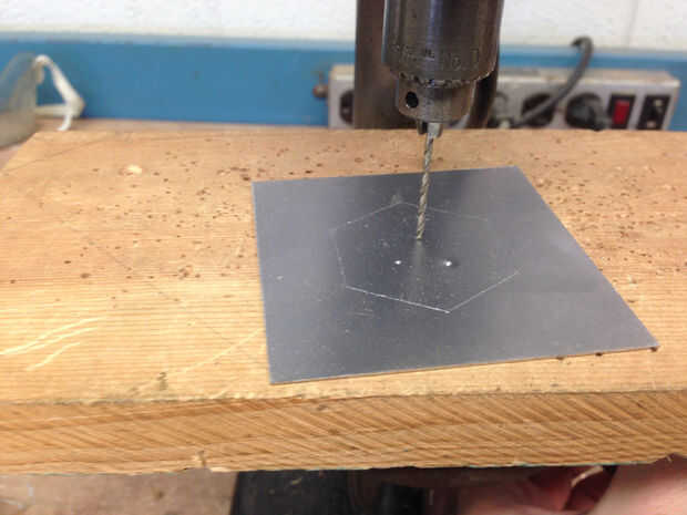 Entonces, que a perforar algunos agujeros en el hexágono para proporcionar un punto de partida para Sierra de joyero cortar. Vamos a usar un punzón de metal y un mazo para golpear tres impresiones en el interior del hexágono, que dará el Taladro broca un punto para anidar en. Luego te traigo lo el taladro. Sé que mi joyero vio hoja es tamaño 3/0, y necesito hacer un agujero que se acomode mirando