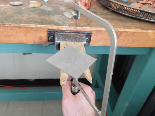 Una vez mis agujeros son perforados, es hora de cortar! Corte de metal con Sierra de joyero puede ser frustrante para los principiantes - probablemente se romperá un montón de hojas de sierra, para no sudarlo. Puede que desee comprobar hacia fuera este tutorial para principiantes.