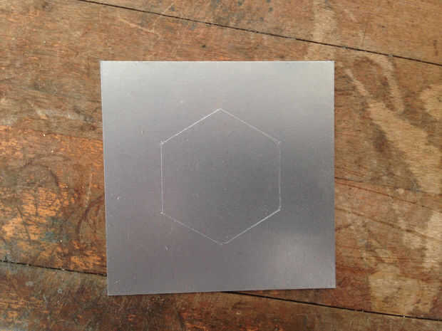 He estado fuertemente desalentado de acero grabado en mi cortador del laser de la Universidad, así que voy a usar mi plantilla de acrílico cortado a láser para marcar un patrón en mi acero a mano. Ya he cortar algunos acero (calibre 20) para que coincida con el tamaño de mi plantilla con una cizalla de banco. Restricción de acceso a uno de esos, también puedes utilizar unas tijeras de mano, o un joyero sierra si eres paciente.