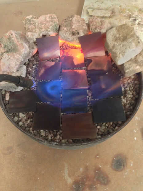 A continuación, voy a templar mi cobre. Porque el uso de la prensa hidráulica es extenuante para el cobre - que forma y estirar-quiero hacer que el cobre sea agradable y suave antes de comenzar. Recocido ablanda el metal, separarse aparte las moléculas para que el metal puede ser trabajado más. Extiende cuántos como puedo en mi recocido de la lata y calentar con un soplete hasta que apenas empiecen a brillar intensamente rojo. Tenazas (el cobre debe estar caliente) luego coger cada uno y apagar en un recipiente con agua para disipar rápidamente el calor.