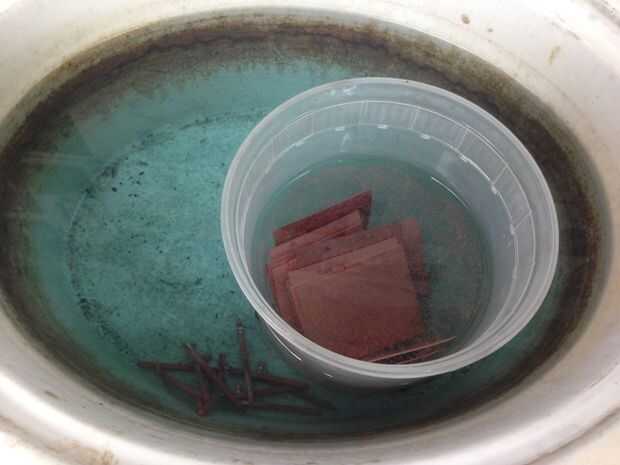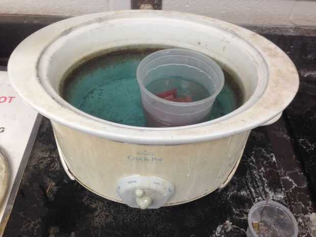 Por último, quiero limpiar mi cobre en salmuera de algunas joyas para deshacerse de la escala de fuego que se produce cuando el metal se oxida de ser incendiadas. Aquí está un Instructable sobre una solución de salmuera DIY, y aquí hay un enlace a una solución más comercial (que es lo que ya hemos preparado en nuestro estudio de los metales). De cualquier manera, recomiendo la olla de cocción lenta, como la baja temperatura aumentarán en gran medida la velocidad a la que se limpia el metal. Salmuera de joyería funciona porque es ácido. Salmuera natural es probablemente un poco más segura, pero ácidos se comer a través de su ropa, puede quemadura mancha tus manos, así que utilice pinzas y todo enjuague después de decapado.