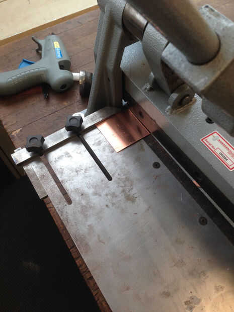 Ahora es tiempo para cortar nuestro cobre. Como con el acero, utilicé un cortante de banco, pero salvo acceso a eso, puede utilizar unas tijeras francés o un joyero Sierra (la voluntad de cobre) más fácil de cortar que el acero. Precisión no es tan importante-como el cobre cabe comfortablemente dentro de los límites de la Plaza de su dado de la prensa hidráulica, con bastante de un labio exterior del hexágono que no obtener aspirado, usted tendría que ser bien.