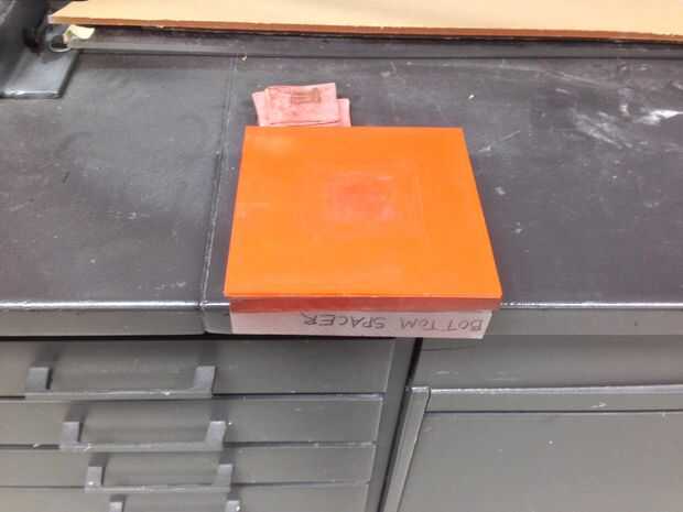 -La parte inferior de la torta es un cuadrado de lucite - esto es sólo un espaciador así que no tenemos que girar tanto a disminuir la distancia entre los dos lados de la prensa.