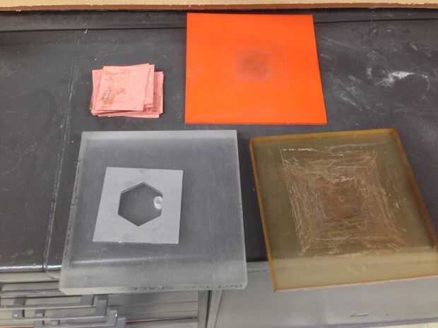 -De cobre, suavemente te Coloque una hoja de goma de uretano suave, teniendo cuidado de no para compensar nuestro cobre o morir en el proceso. Goma de uretano puede adquirirse una variedad de propósitos, pero si usted busca para prensa hidráulica uretano, a subir lo que estás buscando. El uretano suave que estoy usando es sobre un espesor de media pulgada - porque su suave, deforman y comprimen mucho bajo presión, forzando a sí mismo en el espacio hexagonal en nuestro morir y empujar nuestro cobre con él - este es lo que constituye el cobre.