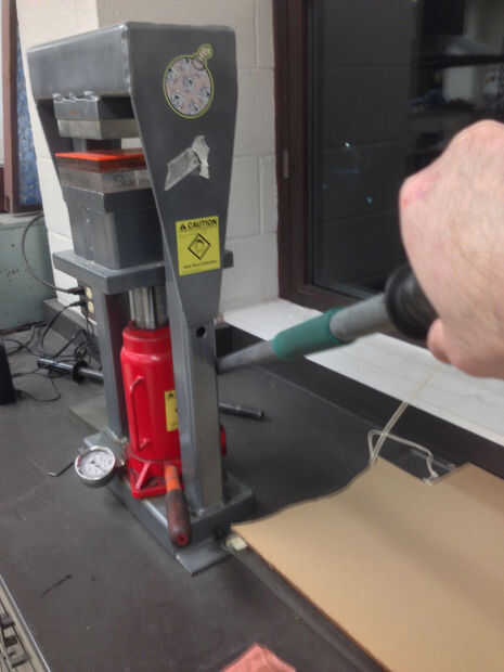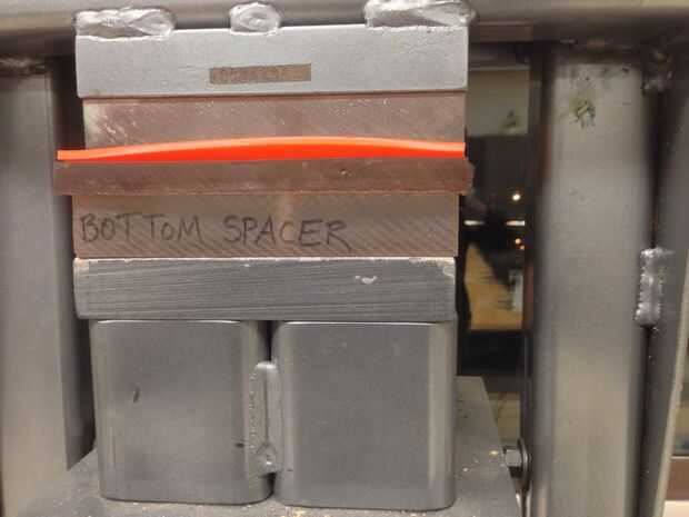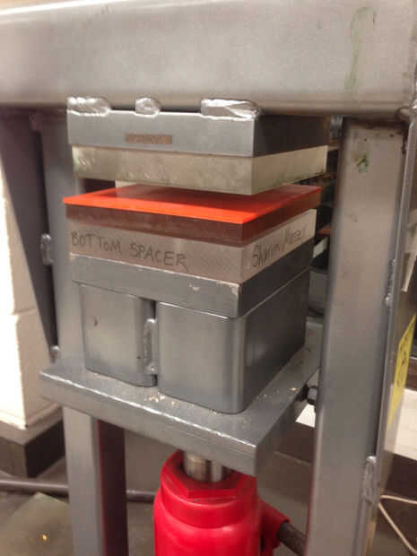 Por lo tanto, vamos a cargar un sándwich compuesto cuidadosamente en nuestra prensa. A lo largo de todo este proceso, queremos mantener todo como centrado en el posible - es toneladas de presión que estamos hablando, y si las cosas están fuera del centro, la presión puede causar realmente bits del sándwich para rodar velocidades increíblemente peligrosa.