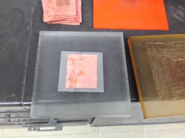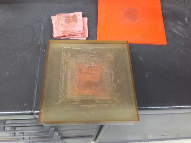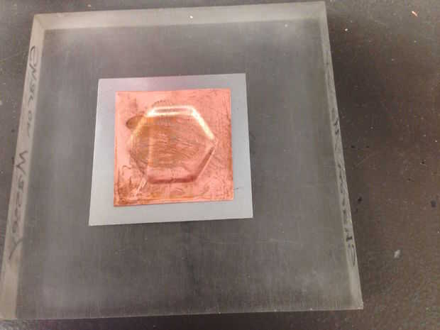 -A continuación, pondremos nuestro acrílico y acero muere en la Plaza, con el acero en la parte superior. El acero es lo que va a presionar en nuestro cobre para darle forma, y el acrílico proporciona más espacio para el cobre a mover como su forma, para darle cierta profundidad más.