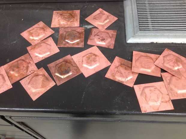 Y allí lo tenemos - un rectángulo con un hexágono redondeado, perfectamente formado dentro de! Ahora vamos a hacer esto un montón de veces, cortar éstos hacia fuera y preparación para esmaltado.