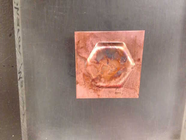 -En lo alto de la die, a puesto nuestro cobre - tenga cuidado de este centro así - los bordes que están dentro de los hexágonos en vez de fuera de sus fronteras se consigue tirados en el dado cuando presiona, haciendo nuestro hexágono imperfecto, por eso queremos mantener esto tan siquiera posible.