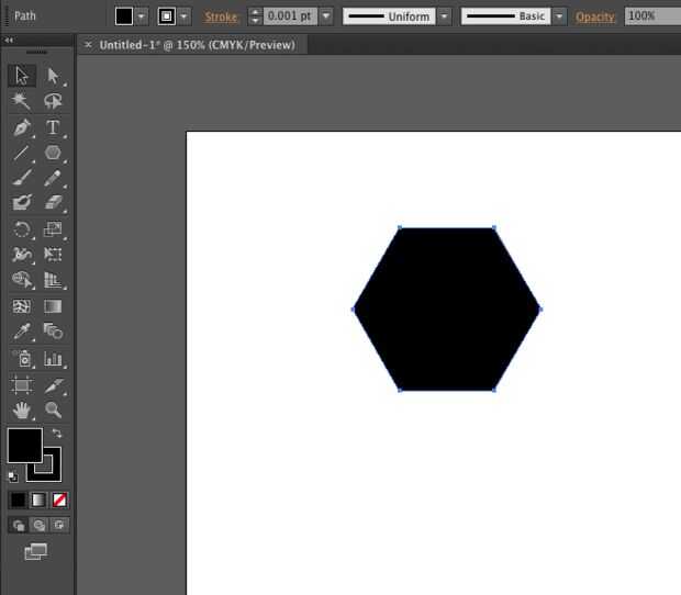 ¿Recuerdas el hexágono que hicimos antes para cortar nuestra plantilla de acrílico? Necesitaremos lo mismo otra vez, excepto que esta vez, queremos un relleno negro además de un movimiento de .001pt negro. Esta manera, seremos capaces de usar el láser para cortar tanto vectoriales como raster, grabado poco a poco la forma del hexágono, también cortando las paredes cada vez, así haciendo el espacio ligeramente más grande que nuestros hexágonos encaja perfectamente. Aferrarse a ese archivo de hexágono! Se trata de cómo colocaremos nuestro patrón para corte por láser terminada nuestra plantilla.