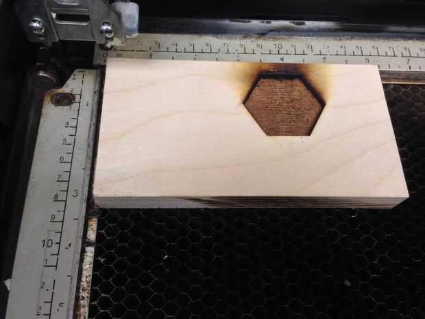 A continuación te queremos un bloque de madera que conocemos es en una esquina - de esta manera, puede anidar cuidadosamente en la esquina de la cortadora láser, en el mismo lugar cada vez, y aun si se mueve, será fácil volver a colocar. "El bloque que utiliza es bastante pequeño - casi 3.5 7," pero es multilaminada de abedul báltica, y unos 3/4" de espesor, por lo que tiene un buen peso y no se mueva muy fácilmente.
