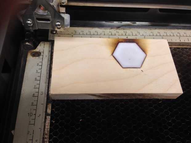 Te queremos dar varias pasadas de la madera poco a poco crear la impresión de que van a quedar nuestros azulejos. Tengo mi laser set 100 poder de vector y raster, 50 velocidad de vector, 40 velocidad de trama y la frecuencia de 2500 para vector. Mis azulejos son aproximadamente 1/4" espesor con todas las capas de esmalte sobre ellos, y me llevó unos 4 pasos hasta que un azulejo puede sentarse cómodamente sin moverse de la impresión. Como capas de madera se cortan lejos, la distancia entre la superficie de la madera y la lente del láser aumentará, por lo que usted desea elevar la cama por consiguiente. Chamuscar la madera ligeramente en el proceso, pero como se puede ver, el azulejo todavía encaja muy bien.