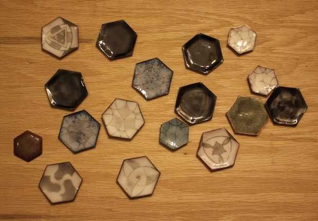 Adjunto los archivos de Illustrator para los azulejos de la colmena que diseñé. Recuerde: usted puede utilizar el hexágono que rodea cada uno de los azulejos para colocar para el cortador del laser, pero no te olvides de quitar el hexágono antes de enviarlo para grabar o querrá hasta con un paso de grabado extra que podría ensuciar encima de su borde. ¡Buena suerte!