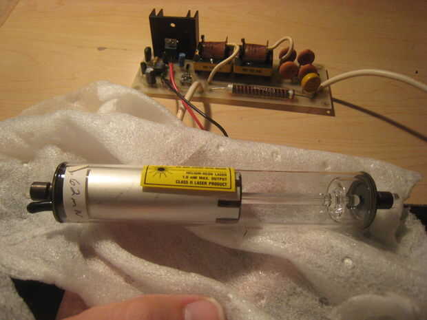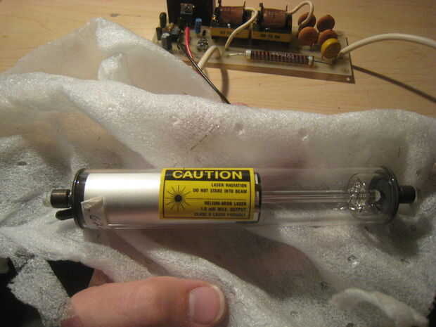El láser es muy bonito en mi opinión. Tiene un extremo de metal y un vidrio. El metal extremo es el extremo negativo (-) y el vidrio es el extremo positivo (+). Mi láser tenía un estirón de la soldadura ya en cada extremo del láser. Esto hizo fácil conectar los cables blancos a él. Asegurarse que los cables no todos torcidos hacia arriba, antes de que la soldadura.
