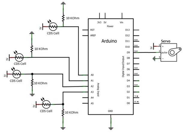 - Si pulsas el botón integrado en el Arduino Duemilanove, los sensores de luz toma una nueva lectura de la línea de base y calcular nuevos valores de disparo de alarma. Esto es útil si cambian las condiciones de iluminación o los sensores no se comportan como se esperaba.