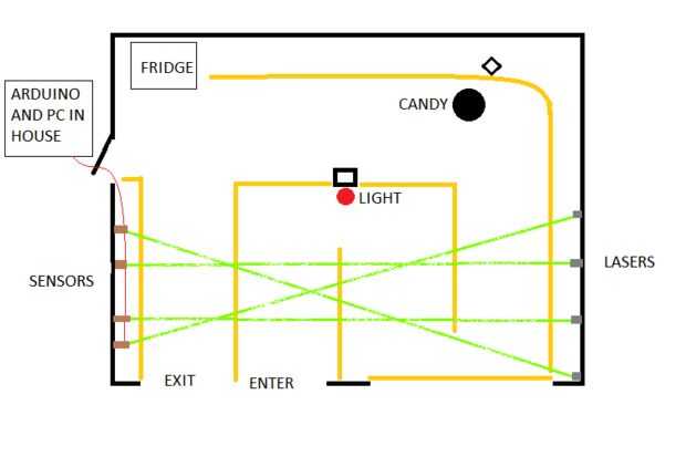 Una vez que el láser powered, colóquelos en su garaje. Poner 4-8 pulgadas de la tierra para que los trajes con vestidos o túnicas pueden hacer sobre ellos. Utilizar soportes en L para sujetar los rayos láser a la pared o montar en cajas o bloques de madera. Utilice cinta adhesiva negra para sostener el botón de encendido en. La imagen de plano muestra cómo configurar el láser y las paredes en mi garaje. Pongo un muro de cinta o cartón de precaución frente a los láseres y sensores para evitar que la gente de accidentalmente golpear o los patear a.
