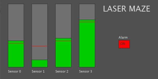- Si se recibe una señal de ON de servo, sabemos que el láser se ha roto. Procesamiento reproduce uno de los clips de sonido de alarma y el indicador de alarma servo se vuelve verde. Hay una demora de segundos 3 desde el inicio del sonido de una alarma al comienzo del próximo sonido. Esto previene la activación constante de los sonidos de alarma.