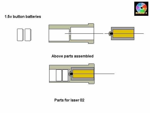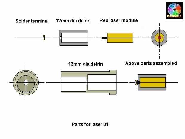 a laser, las baterías y se conectan al botón la cámara unos 12mm redondo delrin (plástico) perforó hacia fuera para aceptar el módulo de láser. El módulo tenía dos plomos voladores, rojo y negro, prueba con un medidor de revelaron que la red estaba conectado a la caja de latón por lo que fue cortado al ras y el cable negro fue reducido a un trozo corto con el extremo descubierto y estañado de la soldadura. Un contacto pequeño de latón con un agujero en el centro se convertiría en el contacto negativo de la batería.