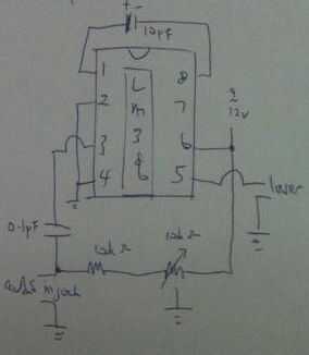 El transmisor consiste de puntero láser, baterías, amplificador de audio LM386, condensador de 10 micro faradio, condensador de 0.1 micro faradio, resistencia de ohmio 10 k, potenciometro de ohmio 10 k y entrada de audio jack. El transmisor convierte y amplificar el audio en una corriente eléctrica transmitida por el láser, haciendo que la intensidad de la luz ser directamente afectados por la intensidad del audio. Este proceso se denomina modulación de amplitud.