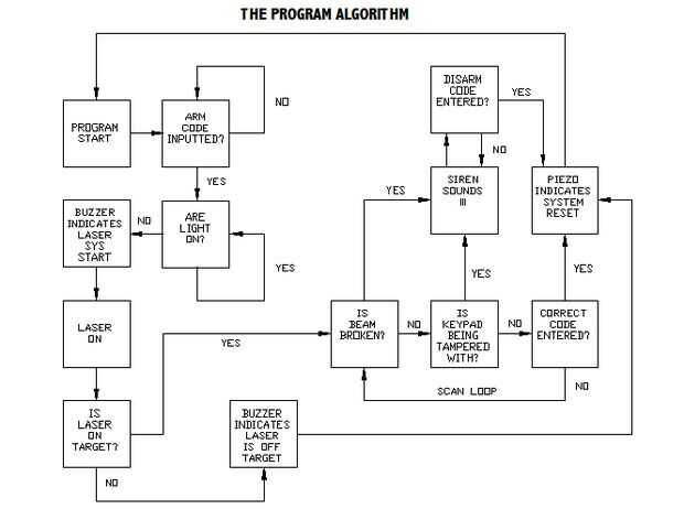 9) si se ha disparado la alarma, la alarma permanecerá encendido hasta que se ha introducido el código de armado/desarmado. Se mantenga escaneo para la señal de armar y desarmar. Cuando el PIC detecta una señal de la línea de armado/desarmado de la LS7222, el piezoeléctrico emite un pitido tres veces para indicar que es reiniciar el sistema. El láser se apaga, y el sistema se inicia en el bloque del programa inicia.