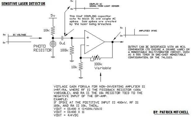 Si tuviera más tiempo, habría puesto un viejo diseño de mina a trabajar. Estaba en un poco de prisa, así que usé el diseño sensible menor. Verás, la mayoría circuitos de detección de láser puedes ver no son sensibles. Foto reóstatos, al tiempo que sensibles a los cambios de luz, no cambiará de (en este caso) 1k (luz) a 25k (oscuridad) tan rápido como puede. Probablemente podría swing tu brazo o por lo menos un dedo por el rayo láser sin la resistencia que gran parte de un cambio. El diseño a continuación, mientras que un poco más complicado, es extremadamente sensible, y lo diseñado hace aproximadamente un año para un cliente que quería detectar su swing de golf.