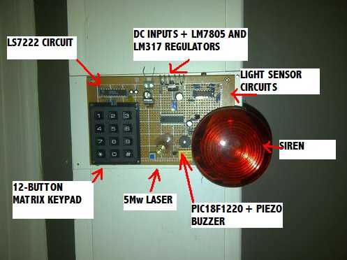 1) un circuito de combinación de la cerradura que emplea la cerradura de combinación versátil de LS7222 IC. El código puede reprogramar con facilidad utilizando el teclado de la matriz. El mismo código se utiliza para armar y desarmar el sistema. Si alguien entra en un carácter incorrecto, la salida de tamper pulsos una advertencia al microprocesador e inicia la secuencia de alarma.