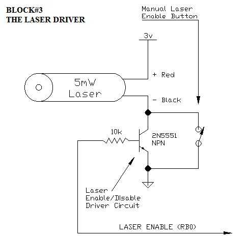 Ah, un paso muy simple! Se trata de un circuito práctico. Contamos con un láser de 5mW simple conectado a la fuente de 3v proporcionada por el LM317 (cable rojo), y el negativo (cable negro) está conectado a un interruptor de transistor a tierra. Cuando se aplica alimentación a la base de este transistor de NPN, transistor actúa para fregadero corriente del colector (conectado al cable negro) a través de para el emisor, que está conectado a la línea de tierra (completando el circuito). El PIC18F1220 salida que RB0 actúa para aplicar energía a la base del transistor a través de un resistor de k 10 protector cuando está activado el programa.