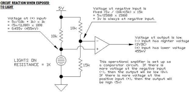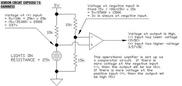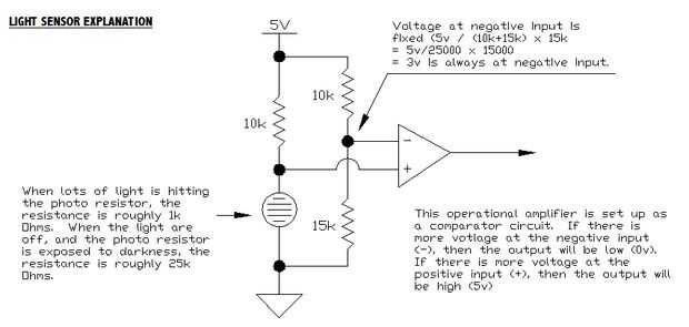 Lo que tenemos aquí es un circuito comparador. Para ello, utilizamos dos divisores de voltaje y uno de los cuatro amplificadores operacionales que se encuentran dentro de la IC LM324. La primera red de divisor de tensión consiste en la resistencia de 10k de izquierda y la fotorresistencia. El segundo circuito divisor de tensión está en el lado derecho, y consiste en otro 10 k resistencia y un resistor de k 15. Ambos divisores del voltaje son ser 5v suministrados. Nos pondremos a ello en un minuto.
